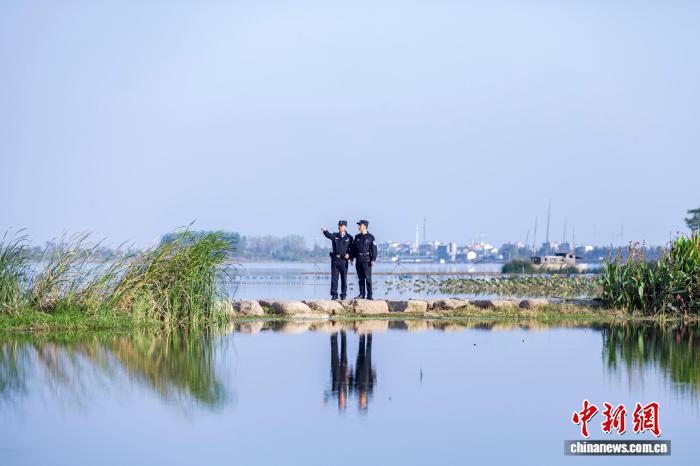 午后,湖北枝江金湖国家湿地公园内微风习习,成群候鸟掠过,在湖面划出一道道弧线。民警戴桐和郑焱沿着岸边巡视,细致查看候鸟的栖息地。