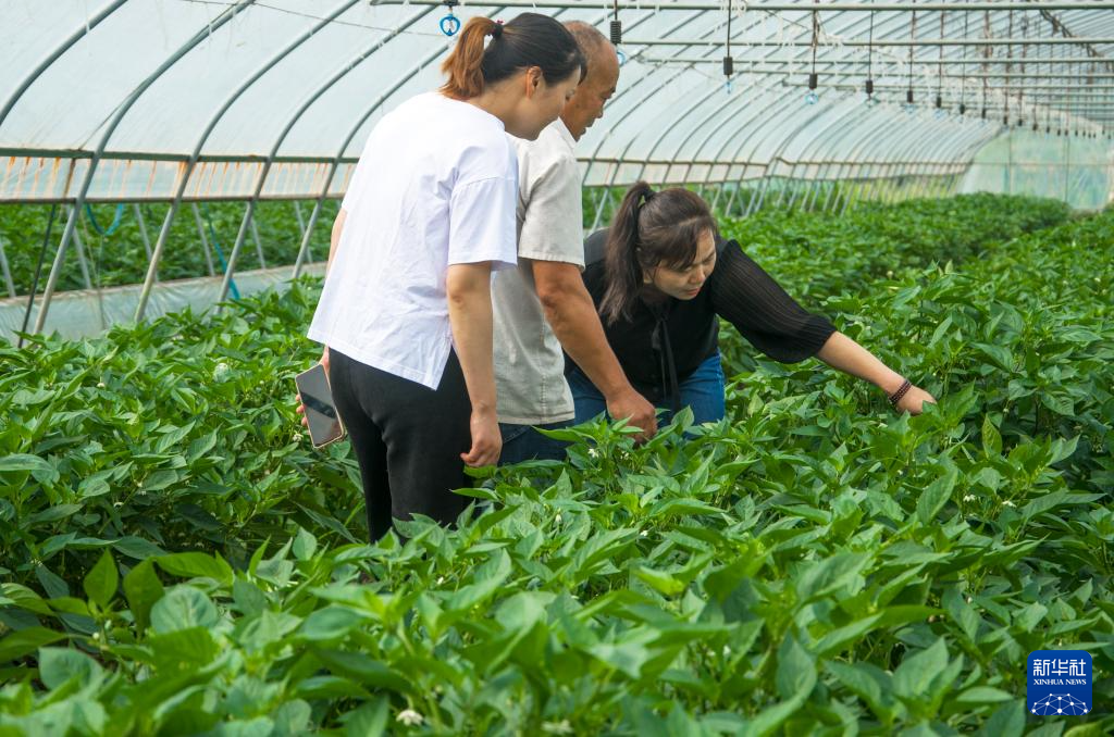 周从贵(右一)和村民在蔬菜大棚里。(红安县委宣传部供图)