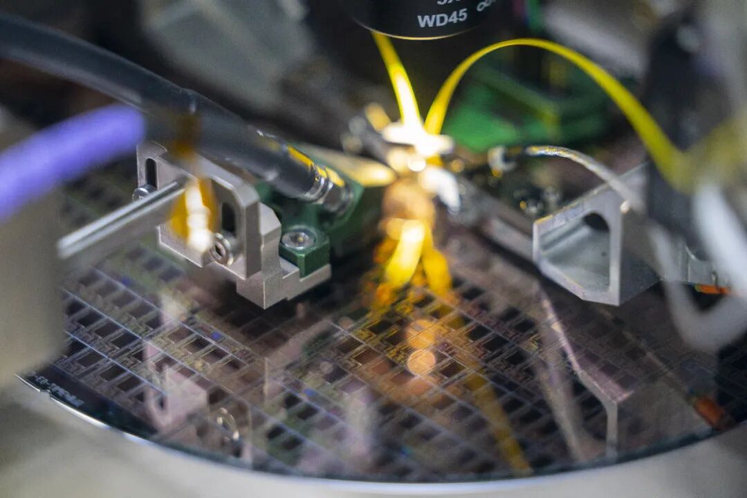 国家信息光电子创新中心无尘实验室内,一片晶圆正被切割成一颗颗芯片(魏铼|摄)