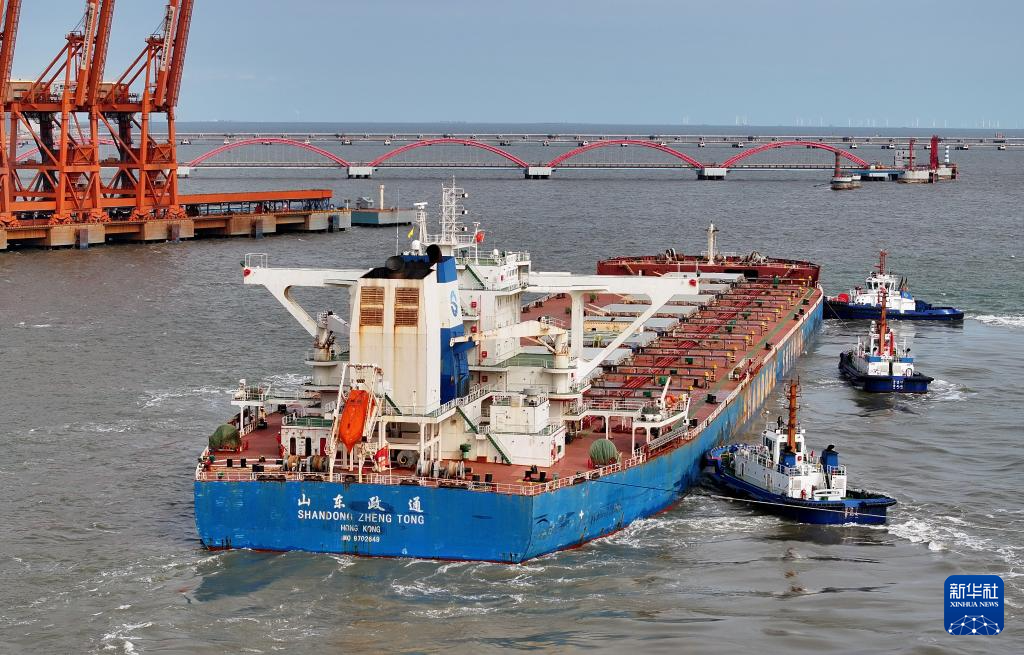 10月16日,一艘轮船在唐山港曹妃甸港区矿石码头卸载后准备离港(无人机照片)。
