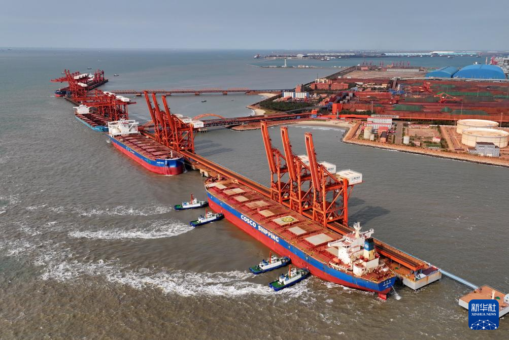 10月16日,多艘轮船靠泊在唐山港曹妃甸港区矿石码头卸载(无人机照片)。