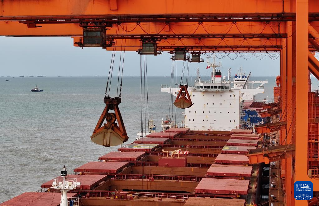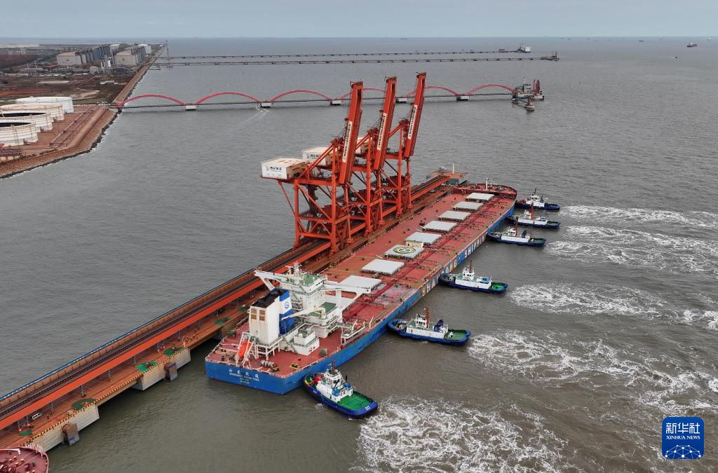 10月16日,一艘轮船靠泊在唐山港曹妃甸港区矿石码头卸载(无人机照片)。