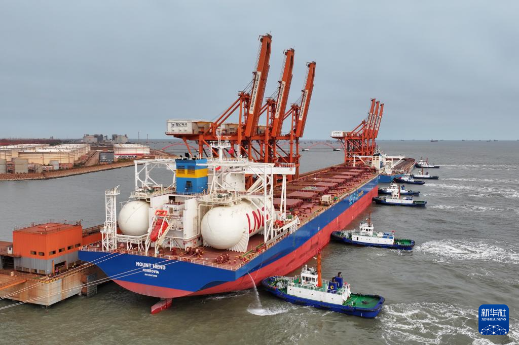 10月16日,一艘轮船在拖轮的协助下向唐山港曹妃甸港区矿石码头靠泊(无人机照片)。