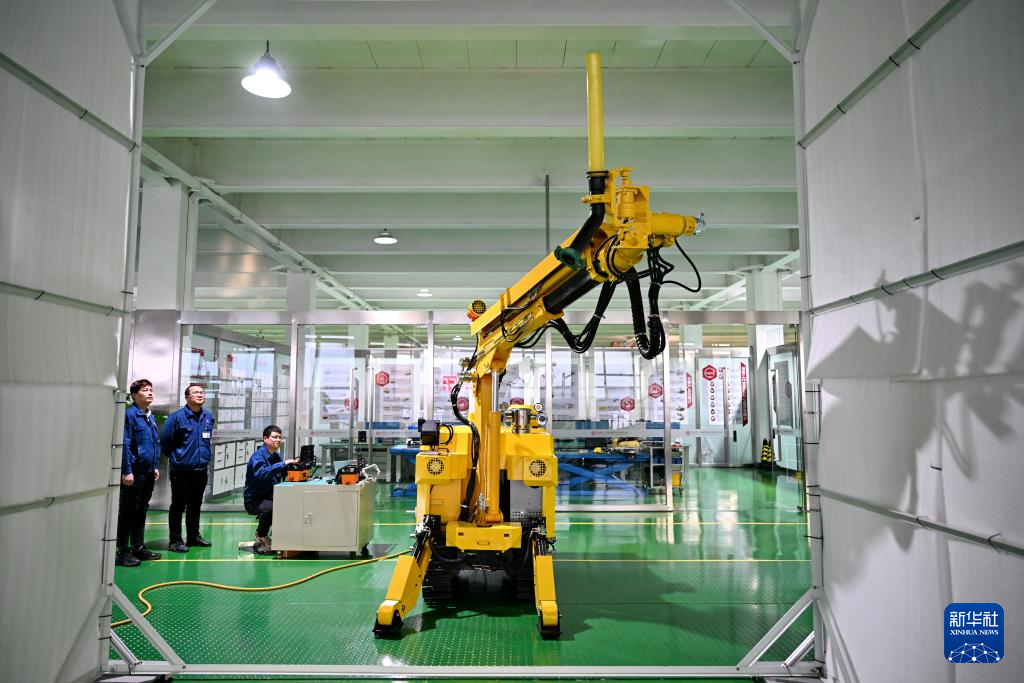 2月18日,工人在唐山国家高新技术产业开发区中信重工开诚智能装备有限公司车间内测试机器人产品性能。