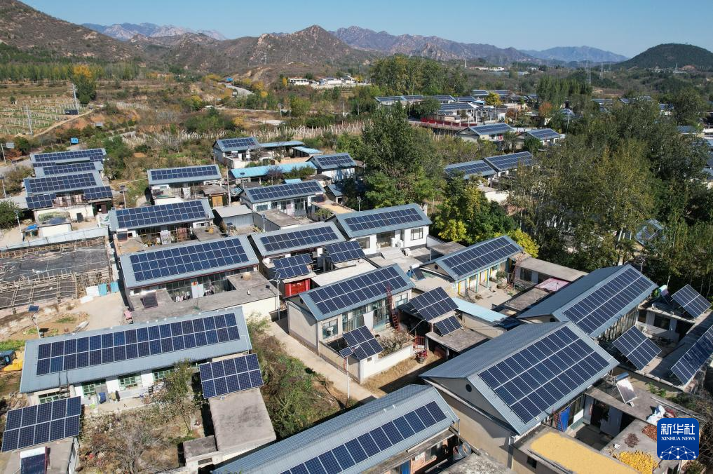 11月2日拍摄的河北省平山县西柏坡镇北庄村兆瓦级“光储”智能微电网示范工程项目中的屋顶光伏发电板(无人机照片)。