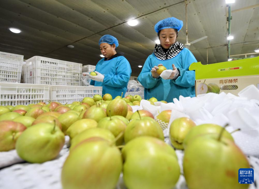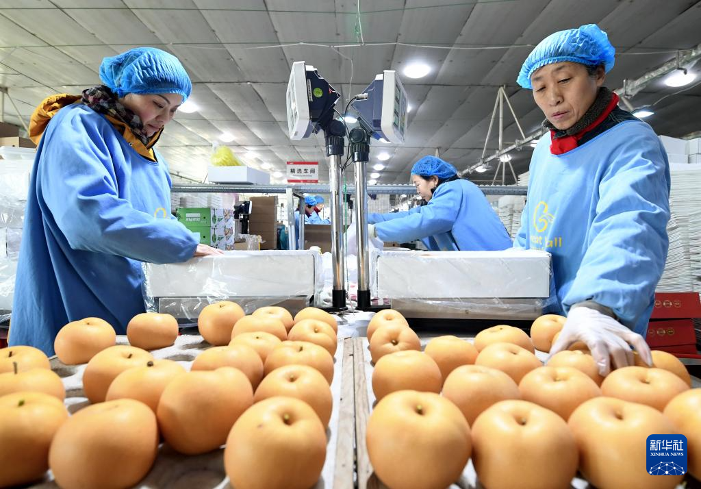 12月8日,工人在河北省晋州市一家果品出口企业的梨分拣包装线上工作。