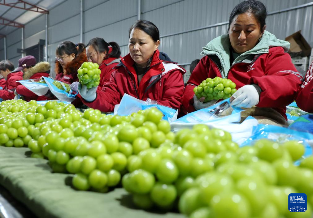 12月8日,工人在河北省晋州市一家果品出口企业的葡萄包装车间工作。