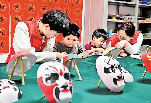 1月28日,团大城县委组织返乡大学生参与公益托管活动。图为志愿者在津保东路社区指导小朋友绘制脸谱。 刘亮摄