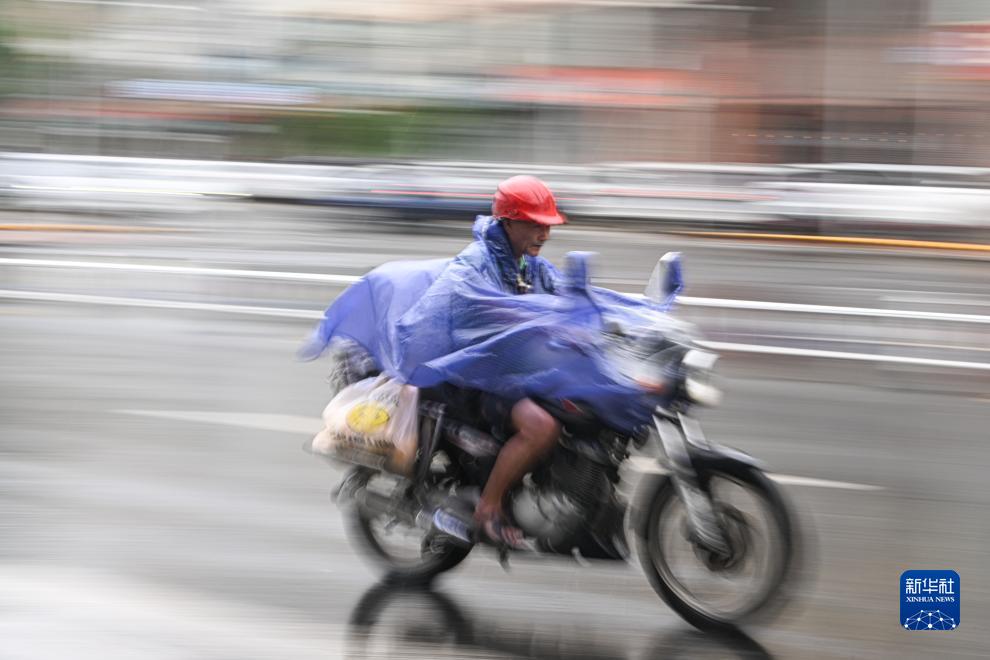 7月17日,市民在海南省文昌市冒雨骑行。