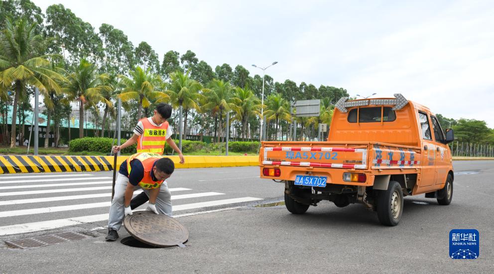 7月17日,在海口市滨海大道,工作人员在检查排水设施。