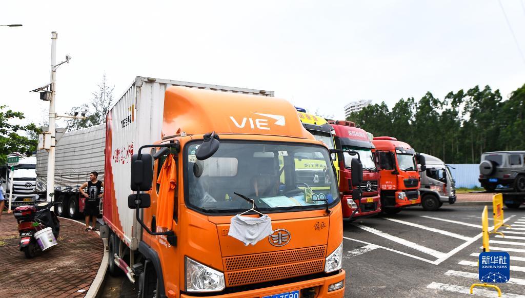 7月17日,不少货车停放在金沙湾二路等地,等待台风过后通过琼州海峡。