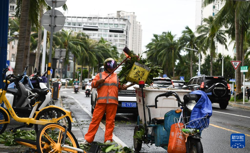 9月7日,在海口市文华路,环卫工人在清理路面。