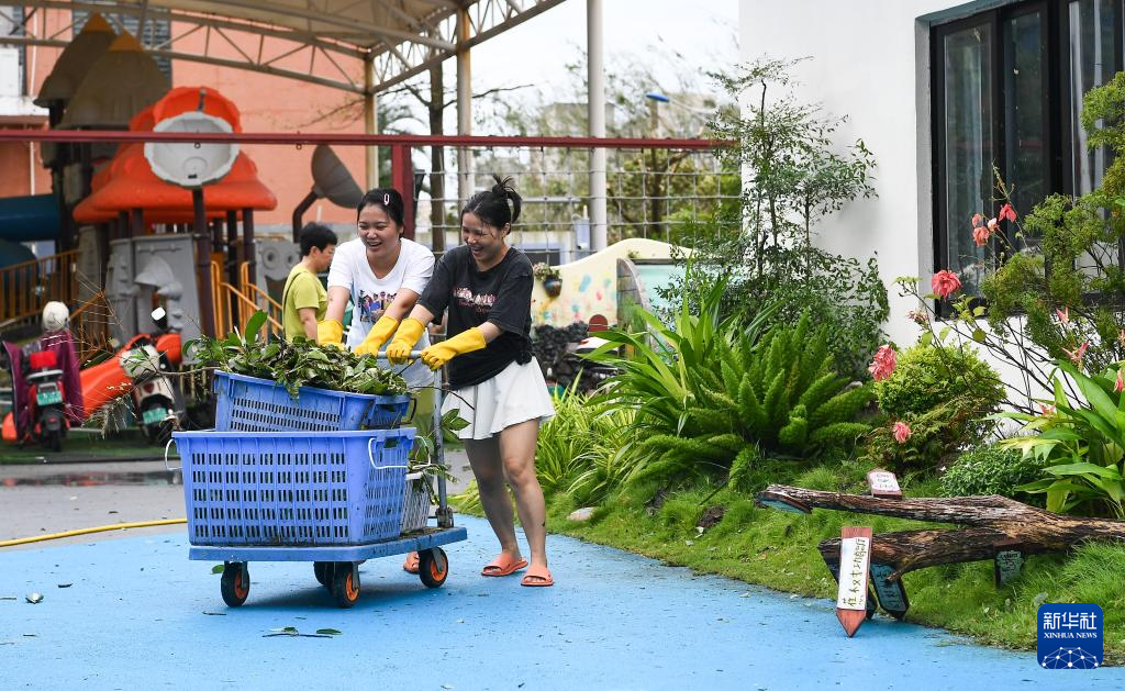 9月7日,在海口市教育幼儿园,工作人员在园区清理。