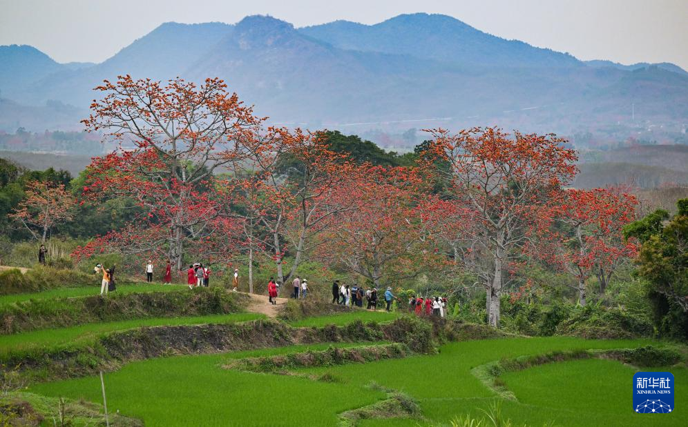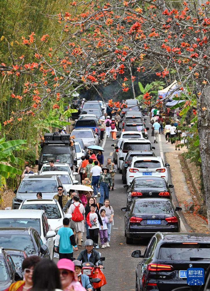 时下正是海南木棉花盛放的季节。在海南省昌江黎族自治县,大批游客前来踏青赏花,感受春天的气息。