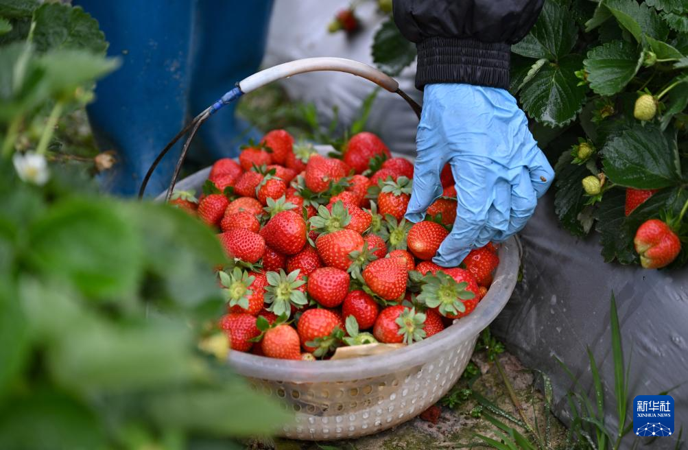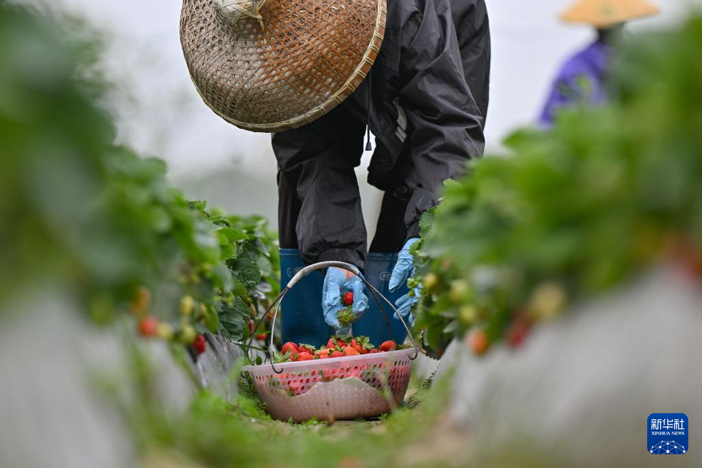 2月23日,海南省儋州市东成镇平地村的农民在采收草莓。