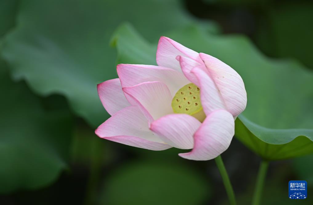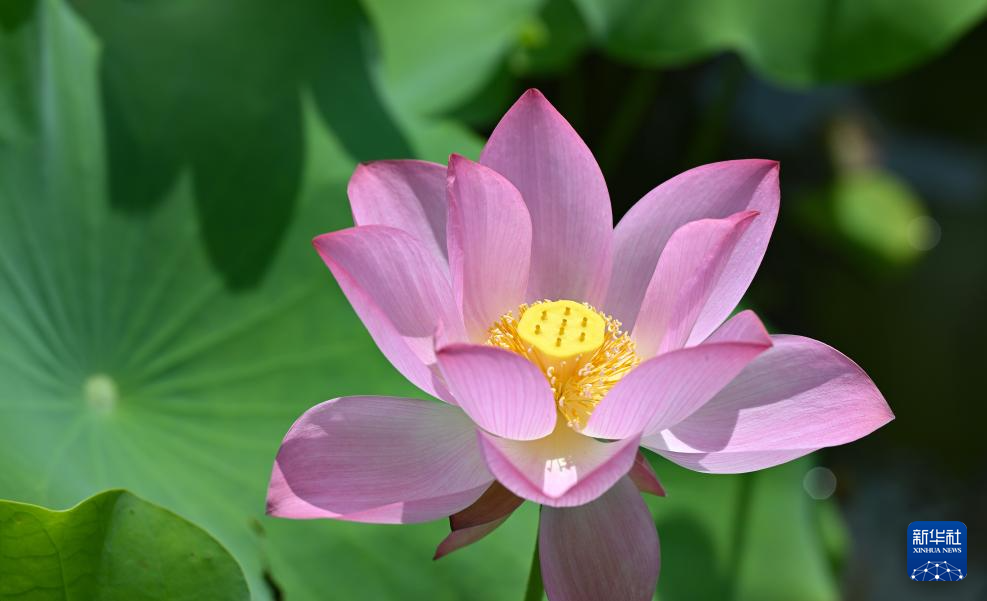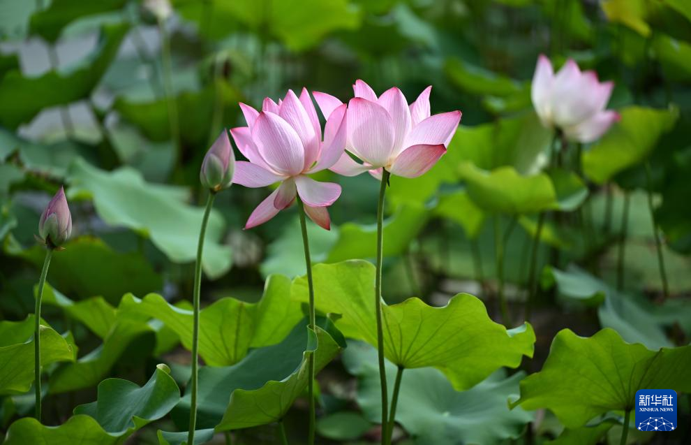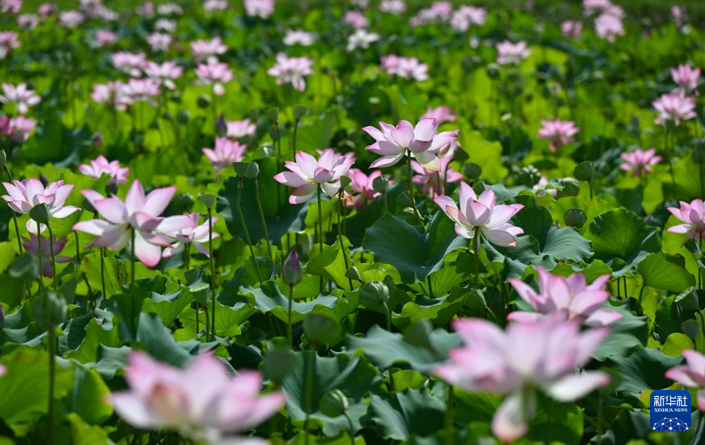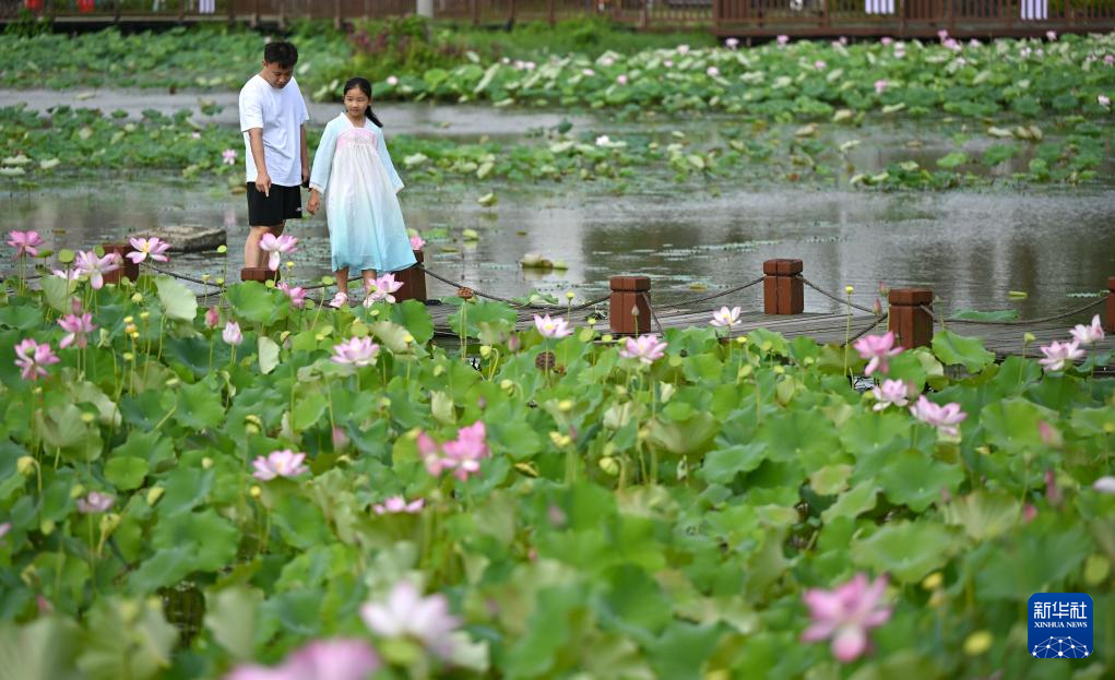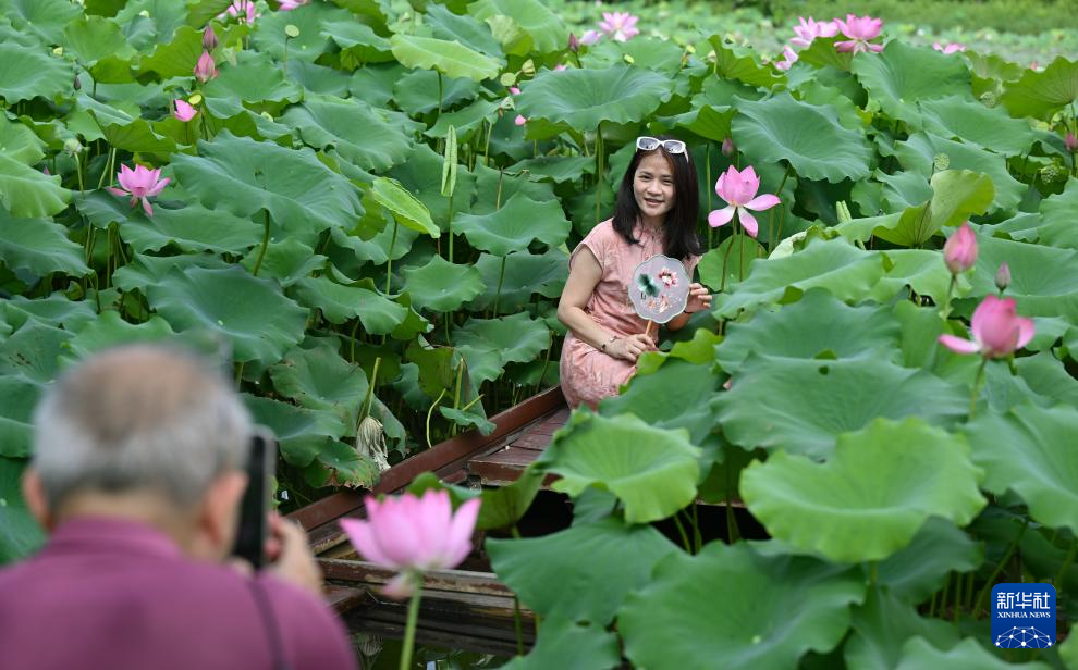 夏日里,海口市美兰区芳园村荷塘里的荷花盛开,吸引市民和游客前来观赏。