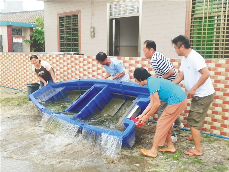 美兰区演丰镇村民清理门前屋后积水。