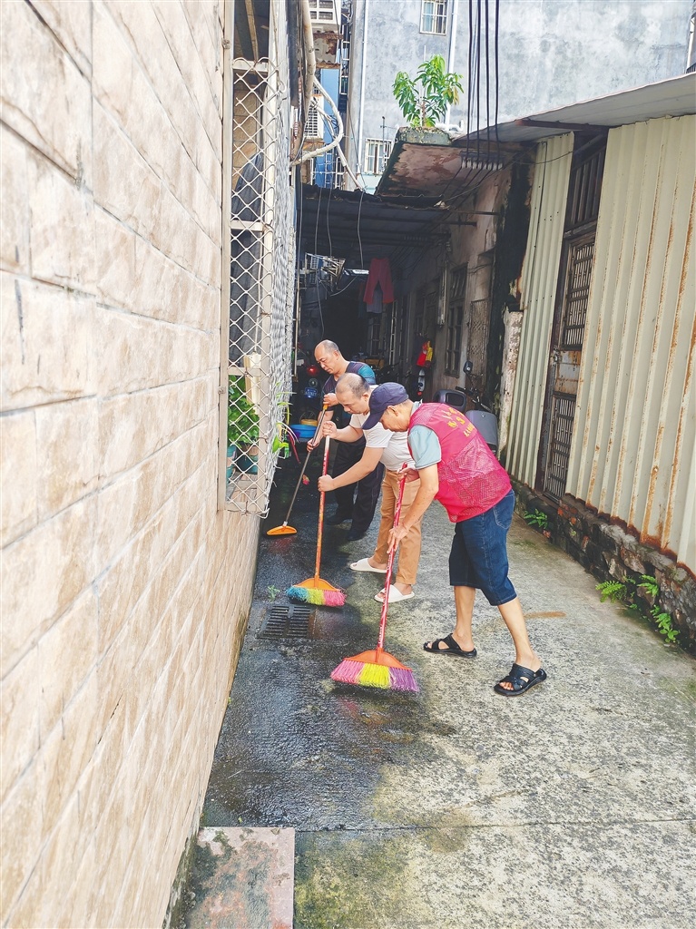 美兰区社区志愿者帮助居民清理积水。本组图片均由特约记者王聘钊摄