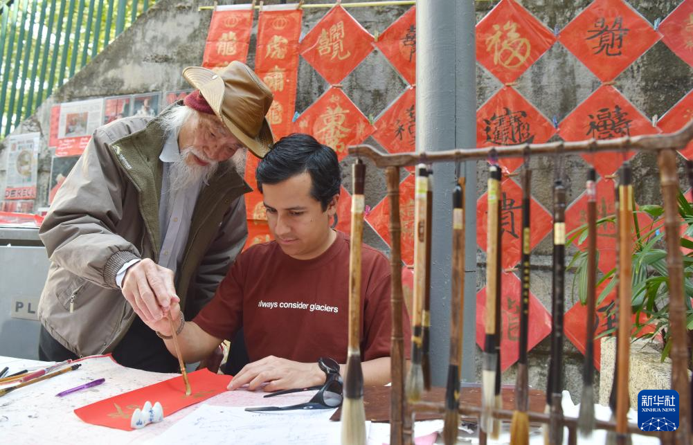 2月13日,在香港楼梯街,萧嘉豪(左)在书写挥春。