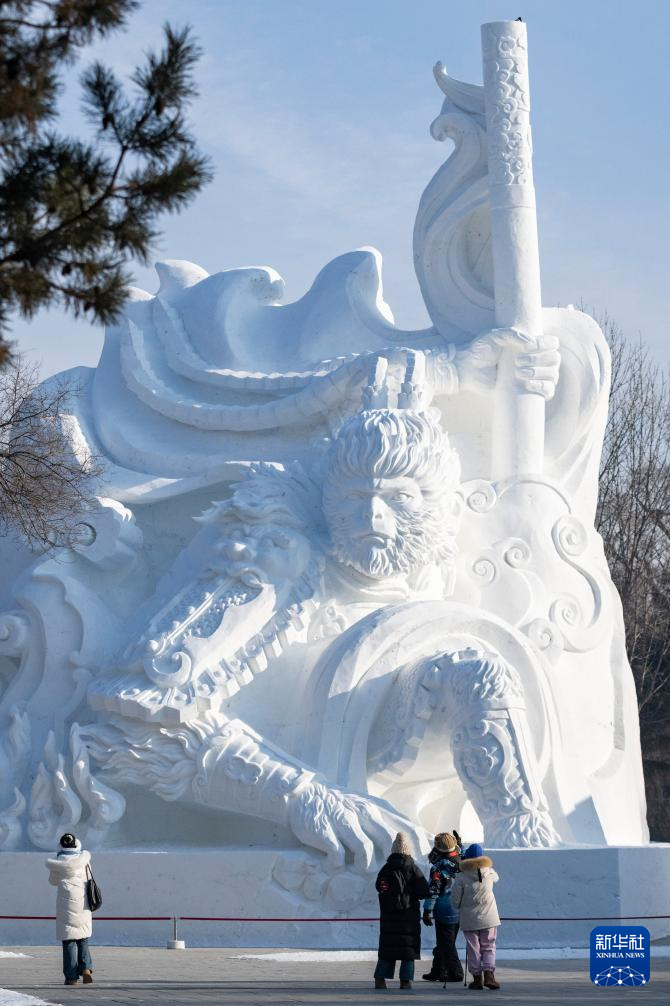 12月20日,在哈尔滨太阳岛雪博会园区,人们观看大型雪雕作品《悟空归来》。
