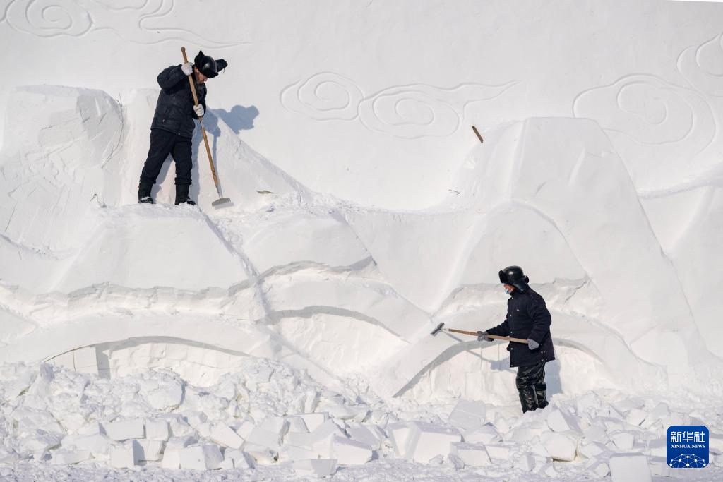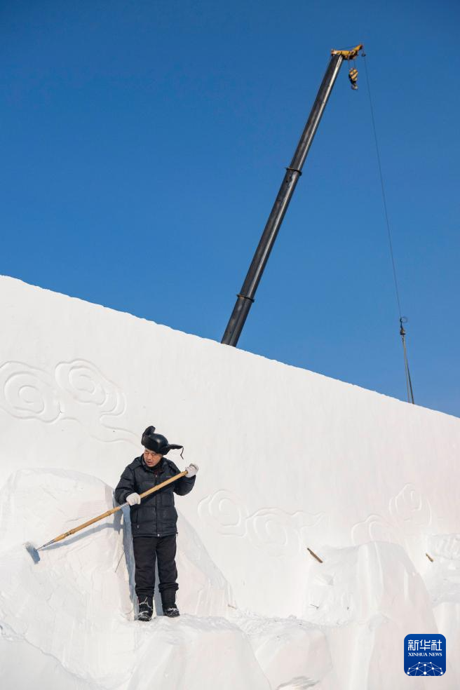 12月20日,在哈尔滨太阳岛雪博会园区,雪雕雕刻师在创作大型雪雕。