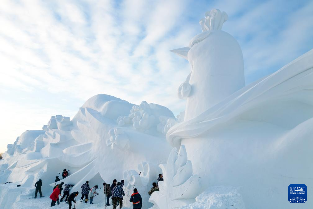 12月23日,雕刻师在哈尔滨太阳岛雪博会园区创作大型雪雕(无人机照片)。