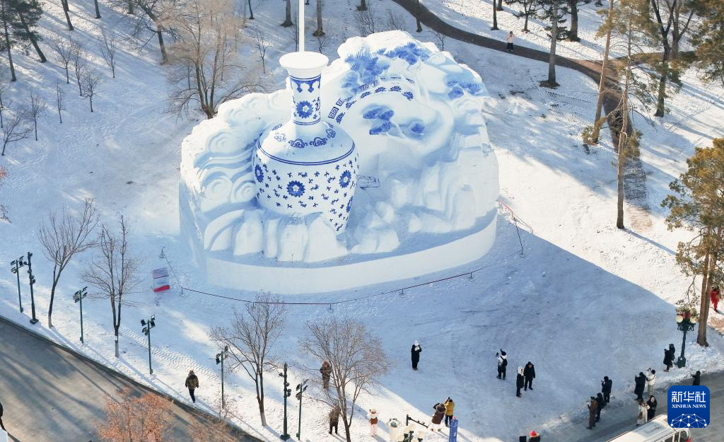 12月23日,人们在第37届太阳岛国际雪雕艺术博览会上游览(无人机照片)。