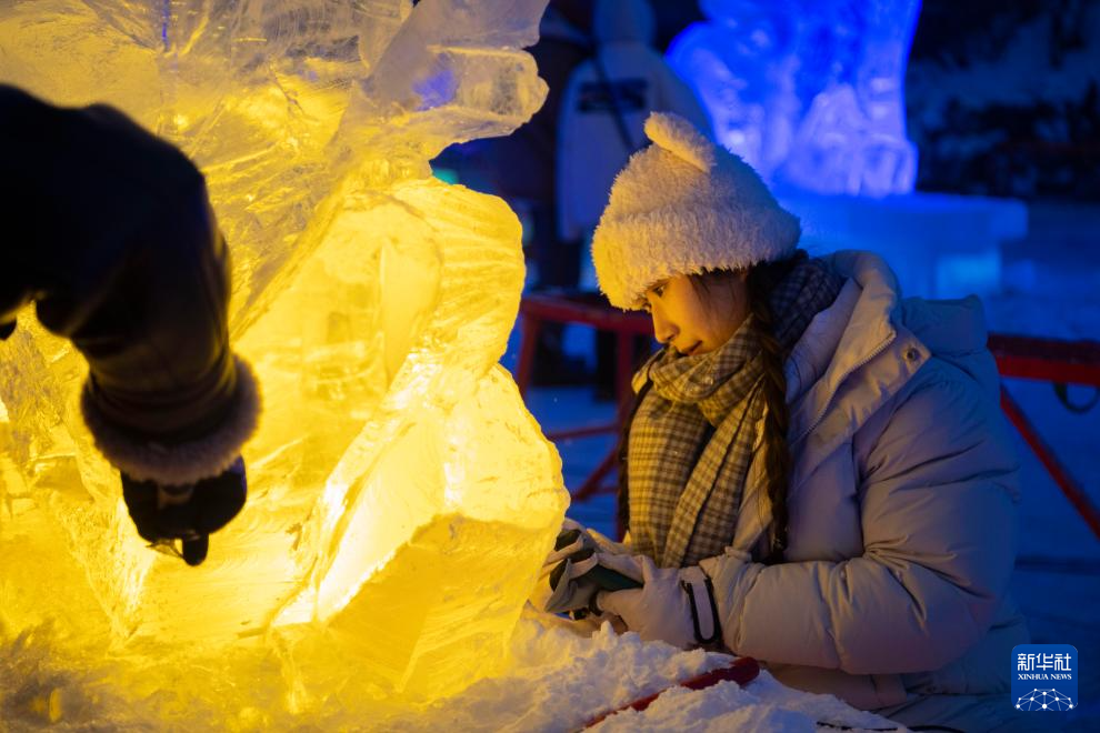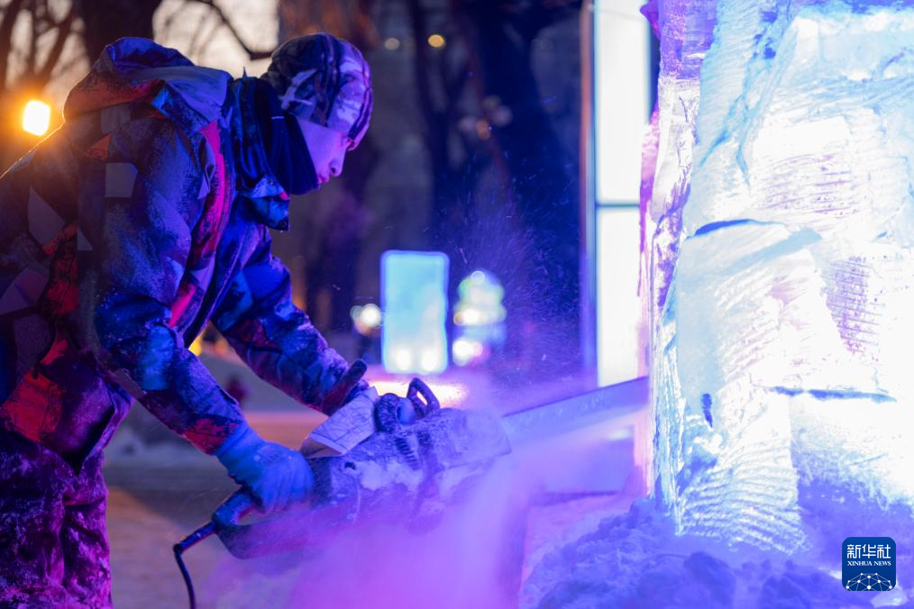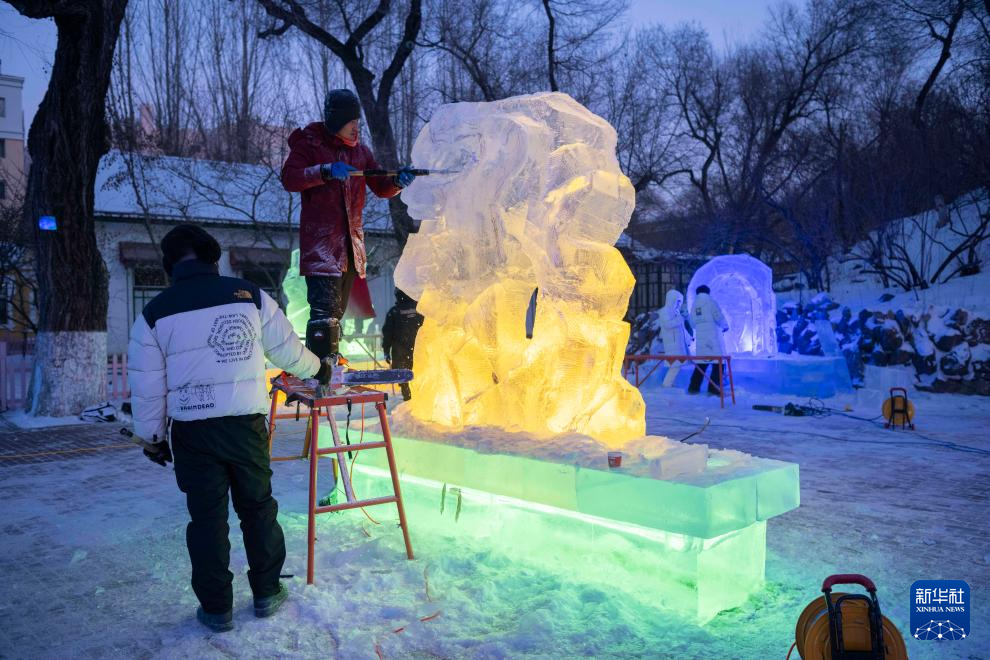 1月2日,在哈尔滨市道里区,冰雕师在兆麟公园内雕琢2025年哈尔滨亚冬会主题冰雕作品。