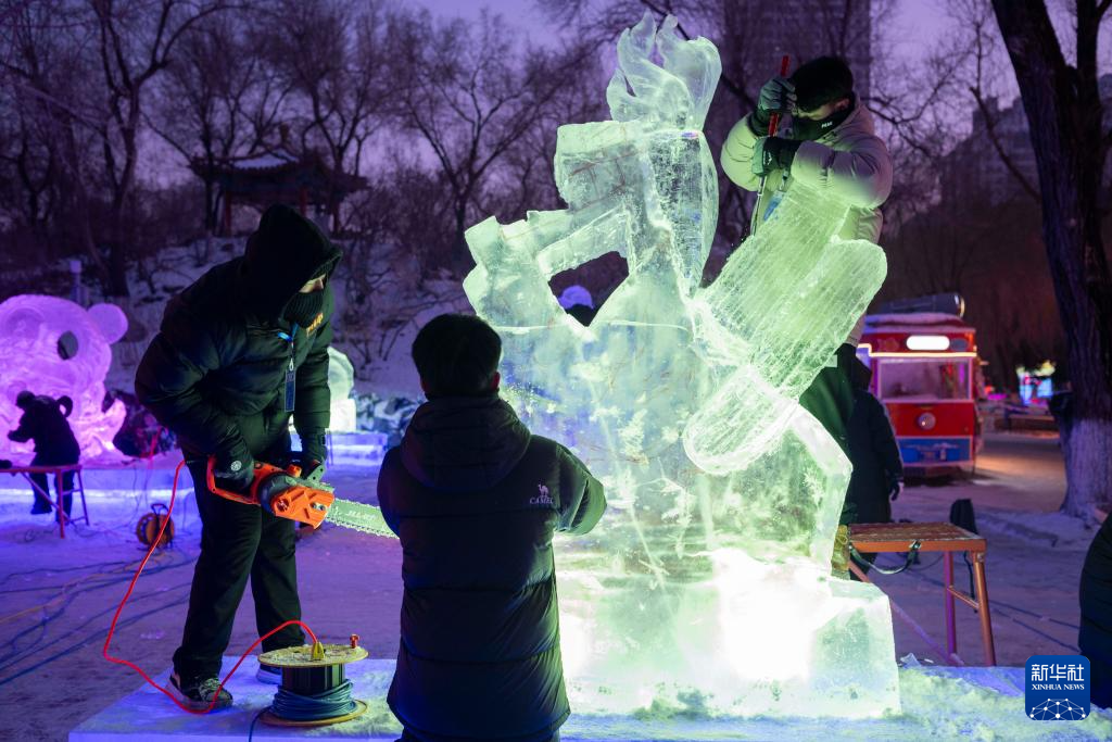 1月2日,在哈尔滨市道里区,冰雕师在兆麟公园内创作冰雕作品。