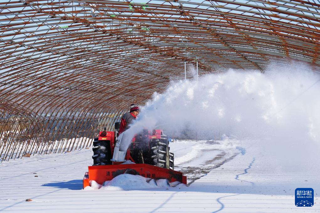 2月20日,在位于双鸭山市的北大荒农业股份有限公司友谊分公司第五管理区水稻育秧基地,种植户进行清雪作业。