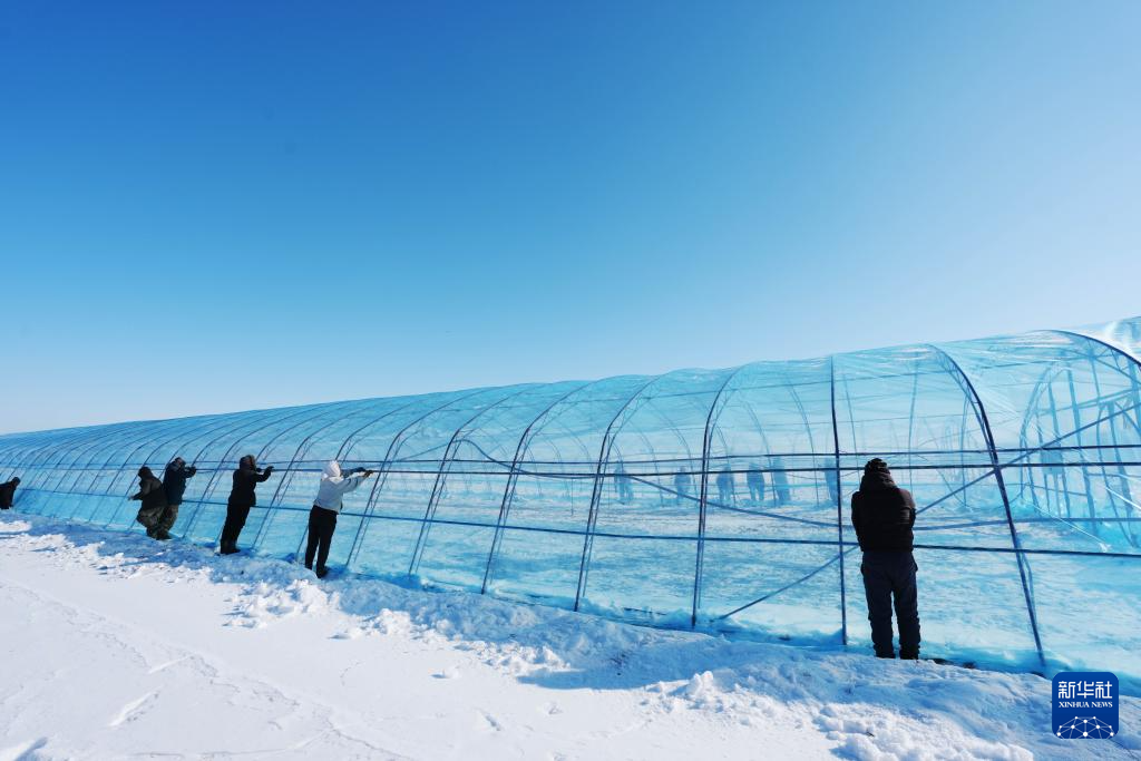 2月20日,在位于双鸭山市的北大荒农业股份有限公司友谊分公司第五管理区水稻育秧基地,种植户进行扣棚作业。