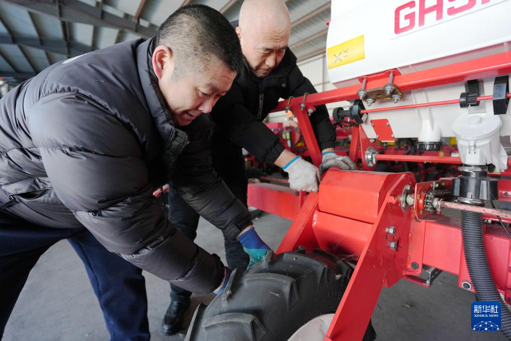 2月20日,在位于双鸭山市的北大荒农业股份有限公司友谊分公司第五管理区第二作业站农机停放中心,友谊分公司员工检修保养农机具。