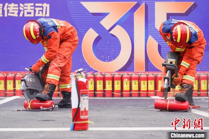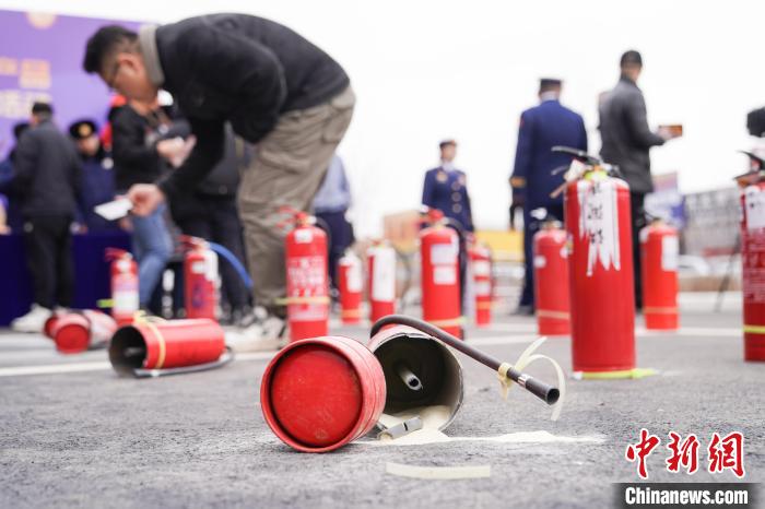 图为消防员销毁不合格灭火器。中新社记者 赵宇航 摄