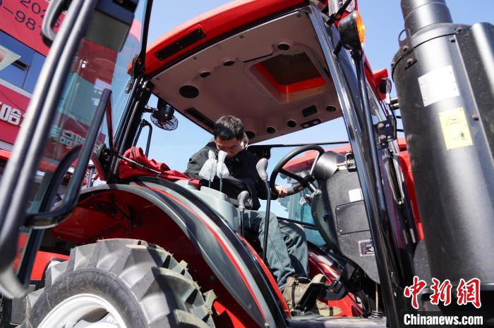 3月18日,黑龙江哈尔滨,观展者在2025黑龙江农机产品展示交易会上体验拖拉机。中新社记者 赵宇航 摄