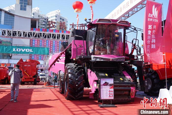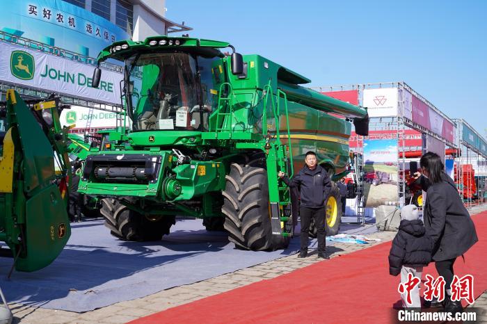 3月18日,黑龙江哈尔滨,在2025黑龙江农机产品展示交易会上大型农机设备吸引观展者。中新社记者 赵宇航 摄