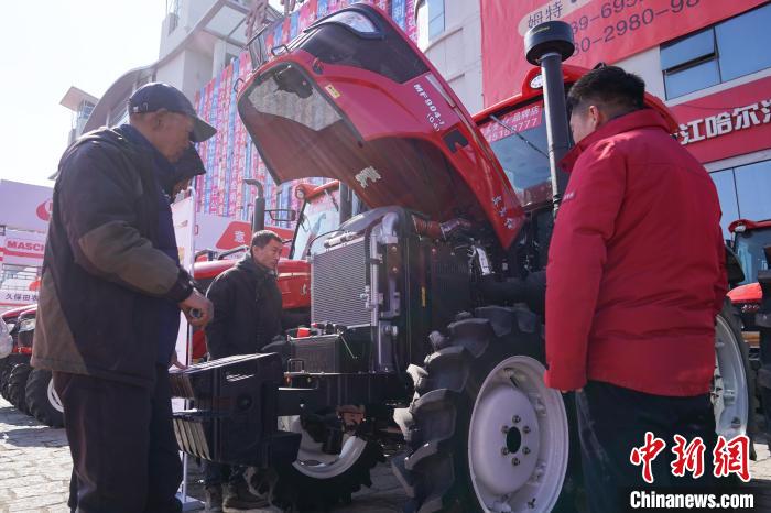 3月18日,黑龙江哈尔滨,观展者在2025黑龙江农机产品展示交易会上咨询农机设备。中新社记者 赵宇航 摄