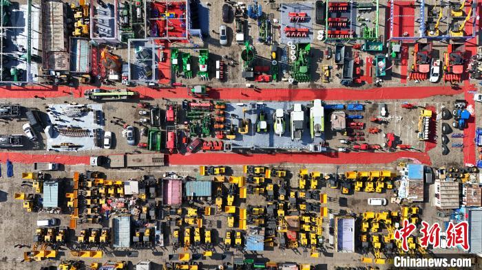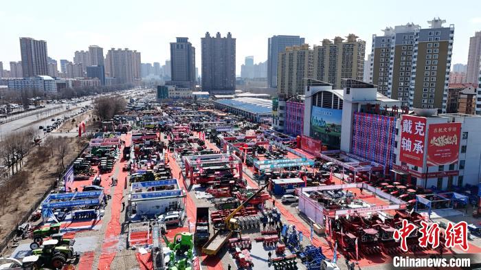 3月18日,黑龙江哈尔滨,2025黑龙江农机产品展示交易会吸引观展者。(无人机照片)中新社记者 赵宇航 摄
