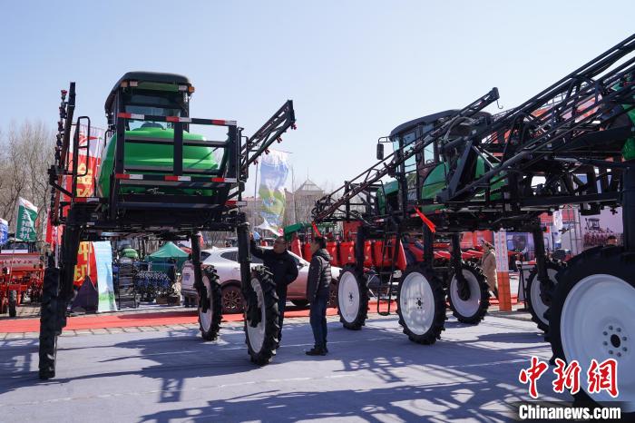 3月18日,黑龙江哈尔滨,观展者在2025黑龙江农机产品展示交易会上咨询自走式喷杆喷雾机。中新社记者 赵宇航 摄