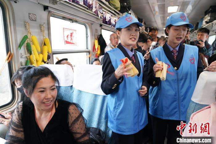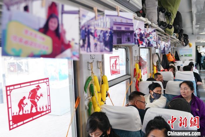 图为专列上的节目表演吸引“插秧客”观看。中新社记者 赵宇航摄