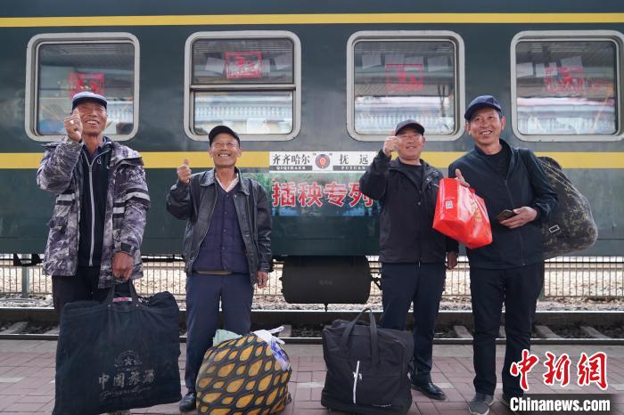 图为“插秧客”在专列前合照。中新社记者 赵宇航 摄