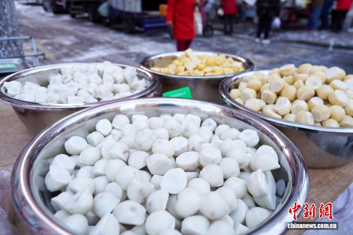 12月2日,黑龙江哈尔滨,冻豆包摆上街头售卖。当日,哈尔滨最高气温今冬首次降到-10℃以下,室外秒变“天然大冰箱”,商贩将冻鱼、冻鸡、冻柿子等摆上街头售卖。中新社记者 赵宇航 摄