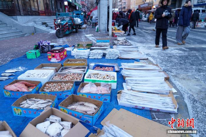 12月2日,黑龙江哈尔滨,各种冻鱼摆上街头售卖。当日,哈尔滨最高气温今冬首次降到-10℃以下,室外秒变“天然大冰箱”,商贩将冻鱼、冻鸡、冻柿子等摆上街头售卖。中新社记者 赵宇航 摄