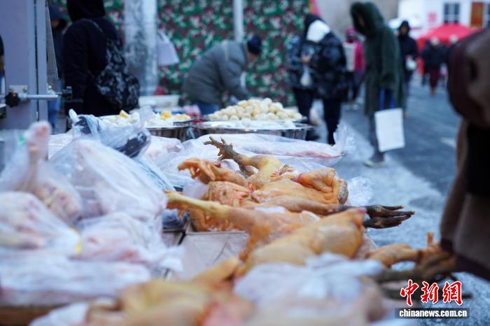 12月2日,黑龙江哈尔滨,冻鸡摆上街头售卖。当日,哈尔滨最高气温今冬首次降到-10℃以下,室外秒变“天然大冰箱”,商贩将冻鱼、冻鸡、冻柿子等摆上街头售卖。中新社记者 赵宇航 摄