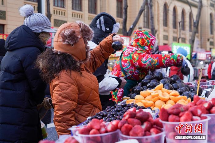 12月2日,黑龙江哈尔滨,市民选购冻梨。当日,哈尔滨最高气温今冬首次降到-10℃以下,室外秒变“天然大冰箱”,商贩将冻鱼、冻鸡、冻柿子等摆上街头售卖。中新社记者 赵宇航 摄