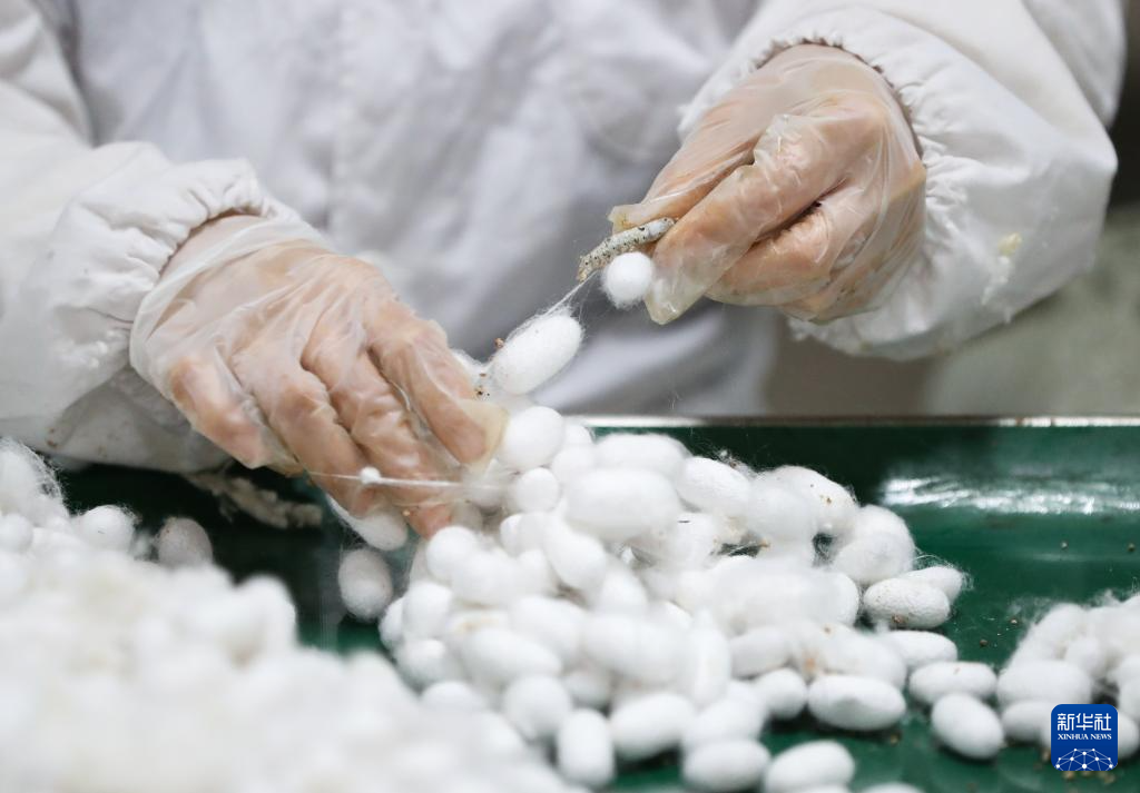 11月24日,一名工作人员在雅士林长沙(国际)蚕桑丝绸智造产业园的采茧生产线上工作。