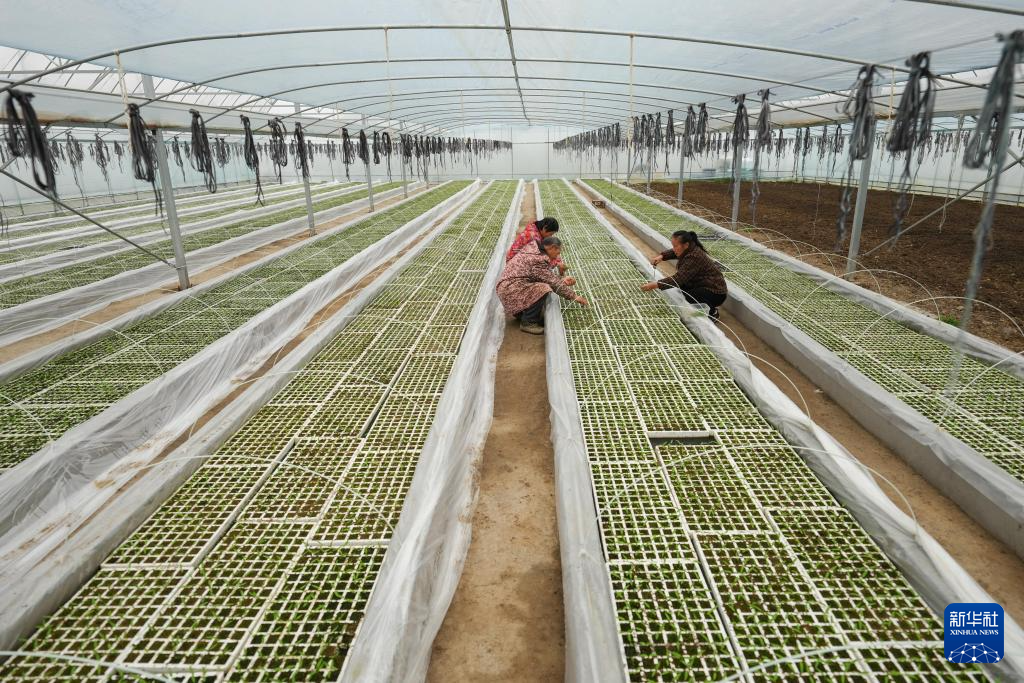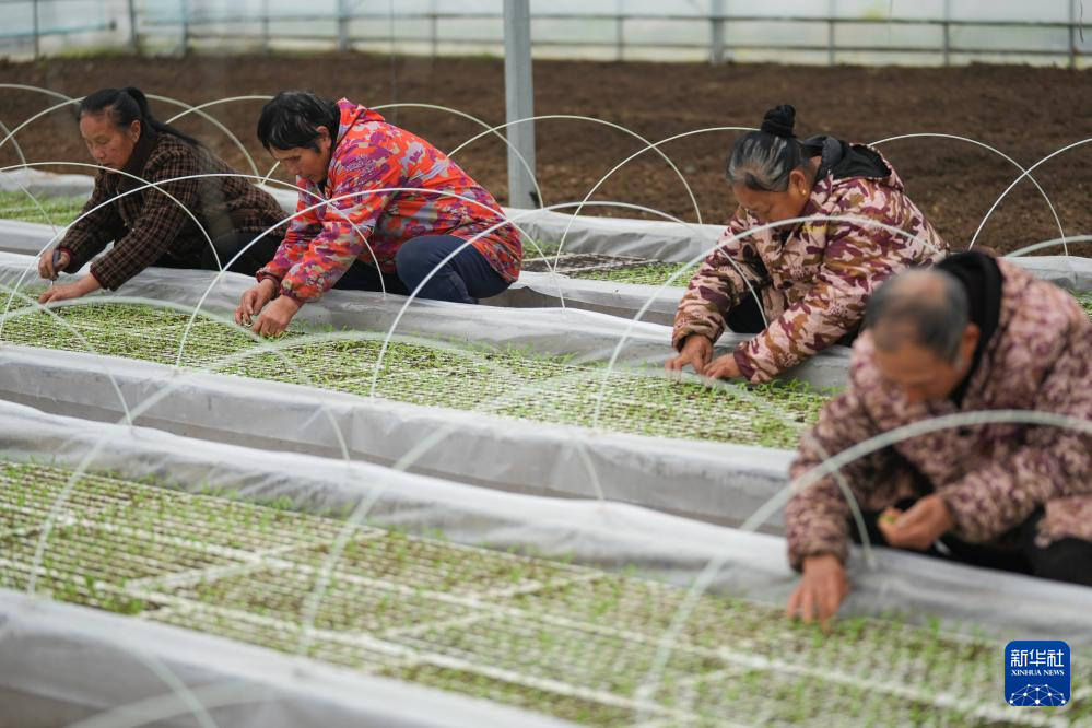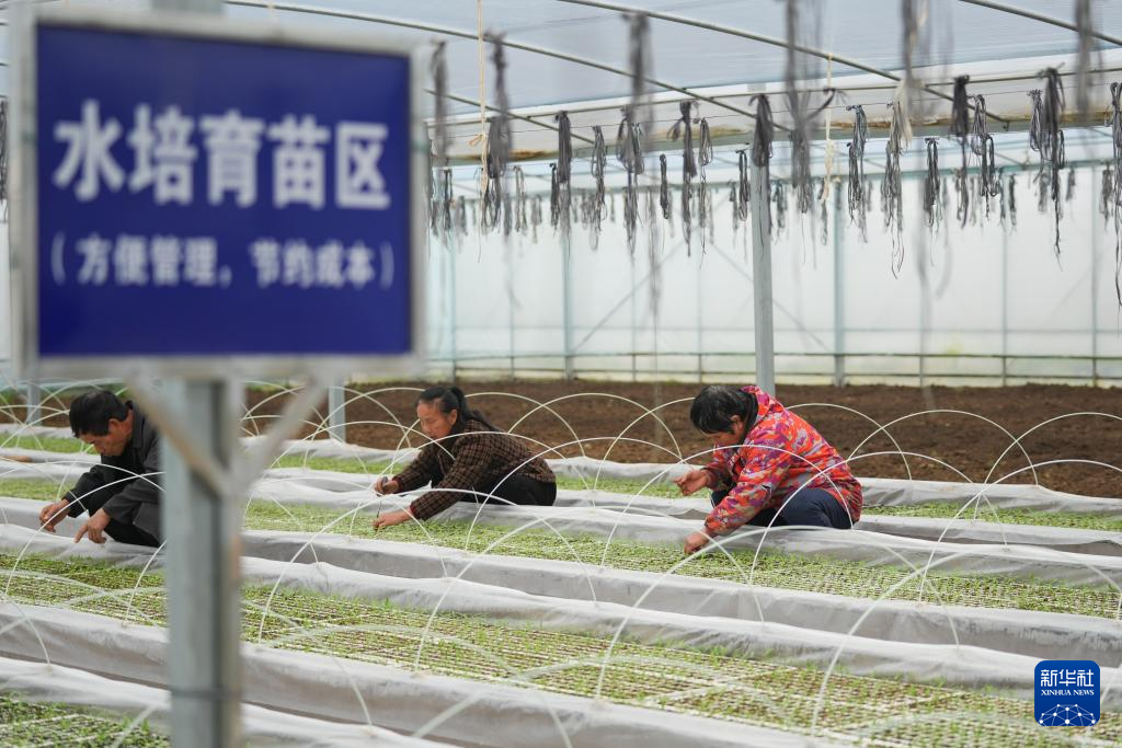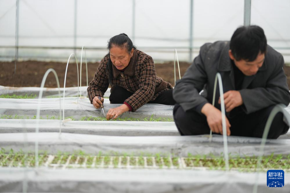 3月12日,在湖南省浏阳市葛家镇的鸡肠子辣椒产业示范基地,工作人员在管护辣椒苗。