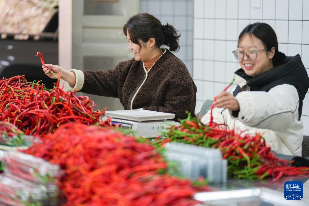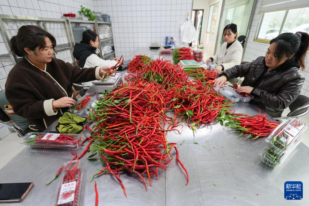 3月12日,在湖南省浏阳市葛家镇的鸡肠子辣椒分拣中心,工作人员在分拣辣椒。