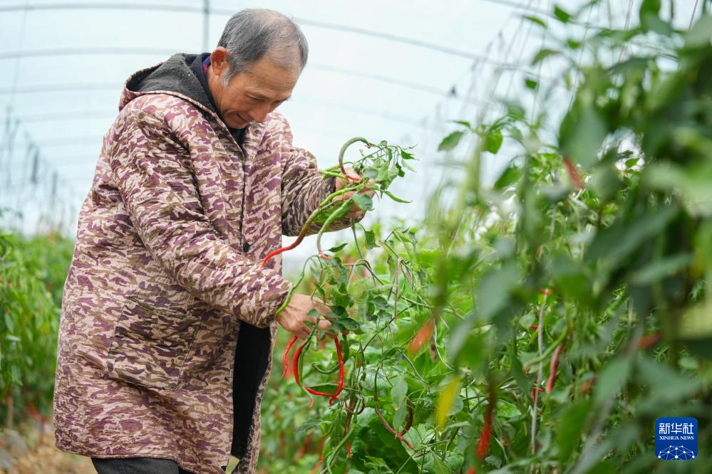 3月12日,在湖南省浏阳市葛家镇的鸡肠子辣椒产业示范基地,工作人员在采摘辣椒。