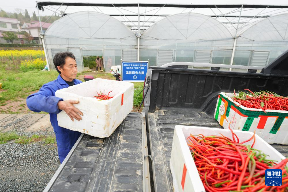 3月12日,在湖南省浏阳市葛家镇的鸡肠子辣椒产业示范基地,工作人员将辣椒搬运上车。