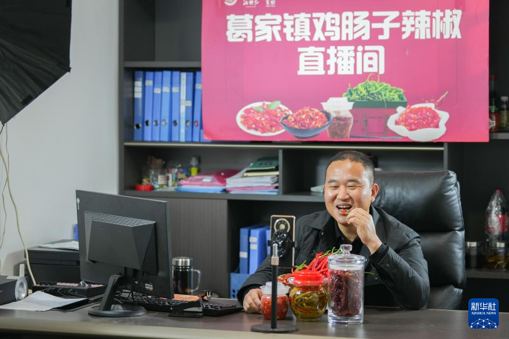 3月12日,在湖南省浏阳市葛家镇的鸡肠子辣椒直播间,工作人员在直播带货时试吃辣椒。